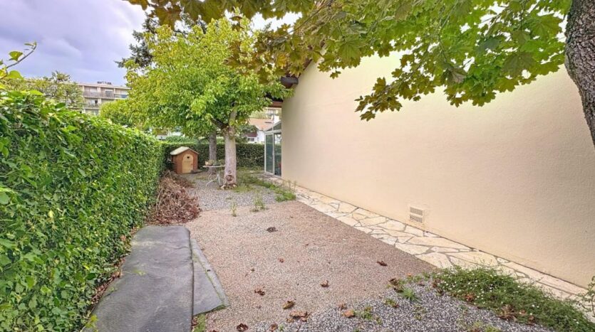 Un jardin, un garage et une véranda.